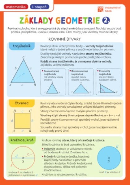 Přehledová tabulka: Základy geometrie 2. díl pro 1. stupeň základní školy, v jedné tabulce, která se vejde do každého sešitu či notýsku. Tento bohatě ilustrovaný a přehledný malý pomocník se hodí všem, bez ohledu na to, jestli je to školák, nebo ne.